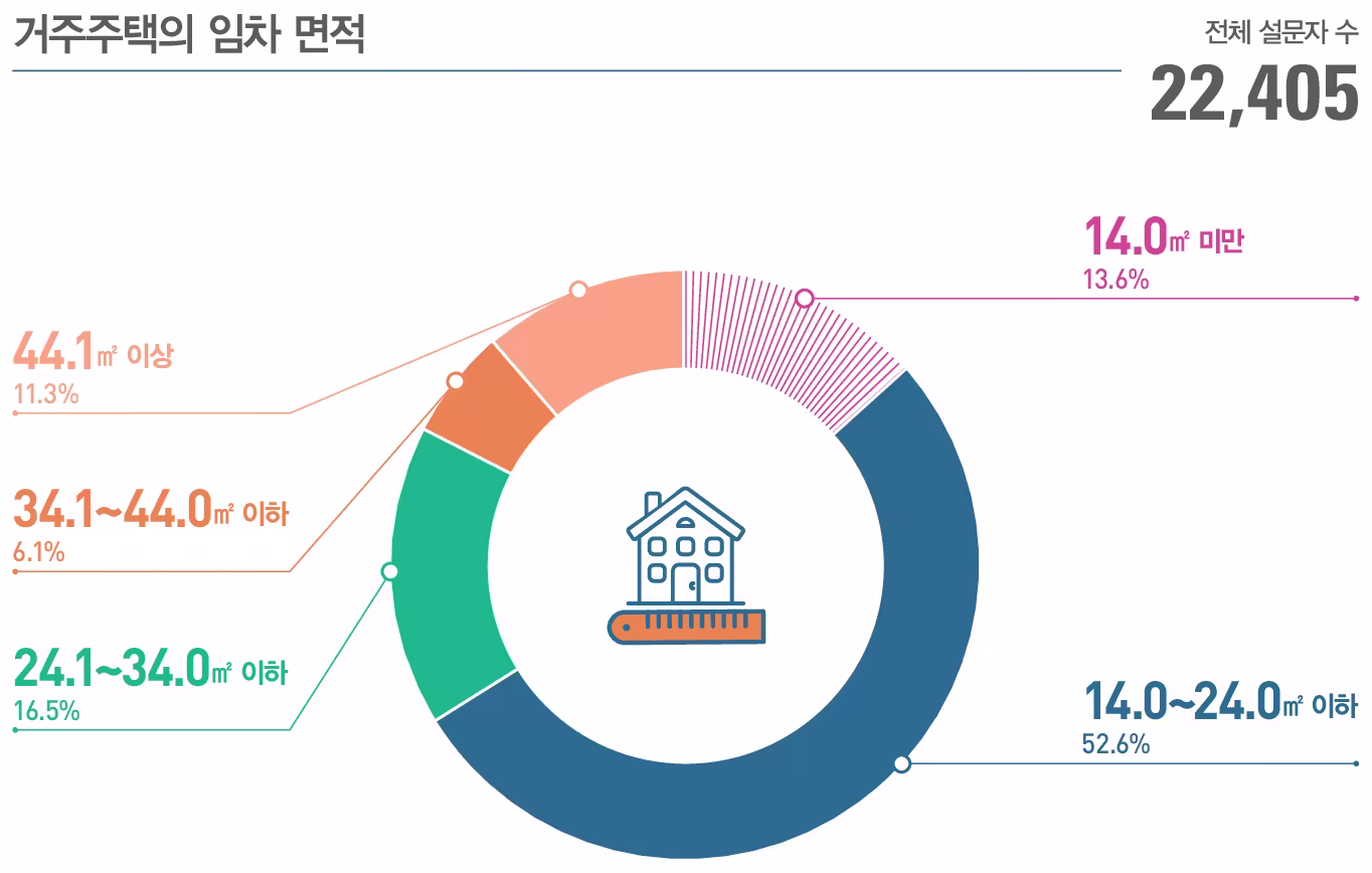 응답자들이 살고 있는 집 규모는 7.3평(24㎡) 이하가 66.2%, 4.2평(14㎡) 미만이 13.6%였다. 지하나 옥탑방에 사는 사람은 14.6%였다. 보증금은 500만 원 이하가 전체의 절반(49.1%)을 차지하며, 나머지는 보증금 1천만 원대였다.